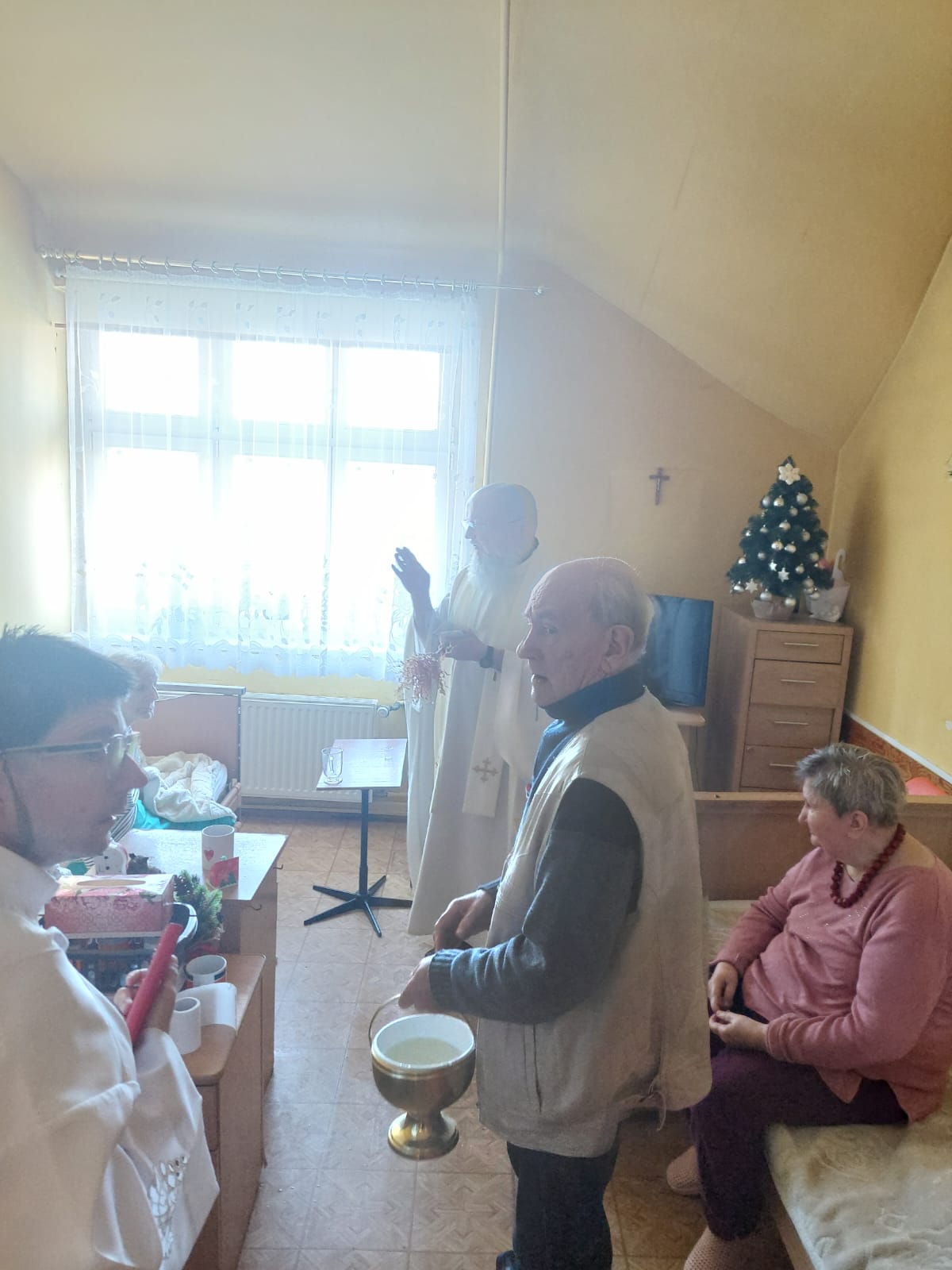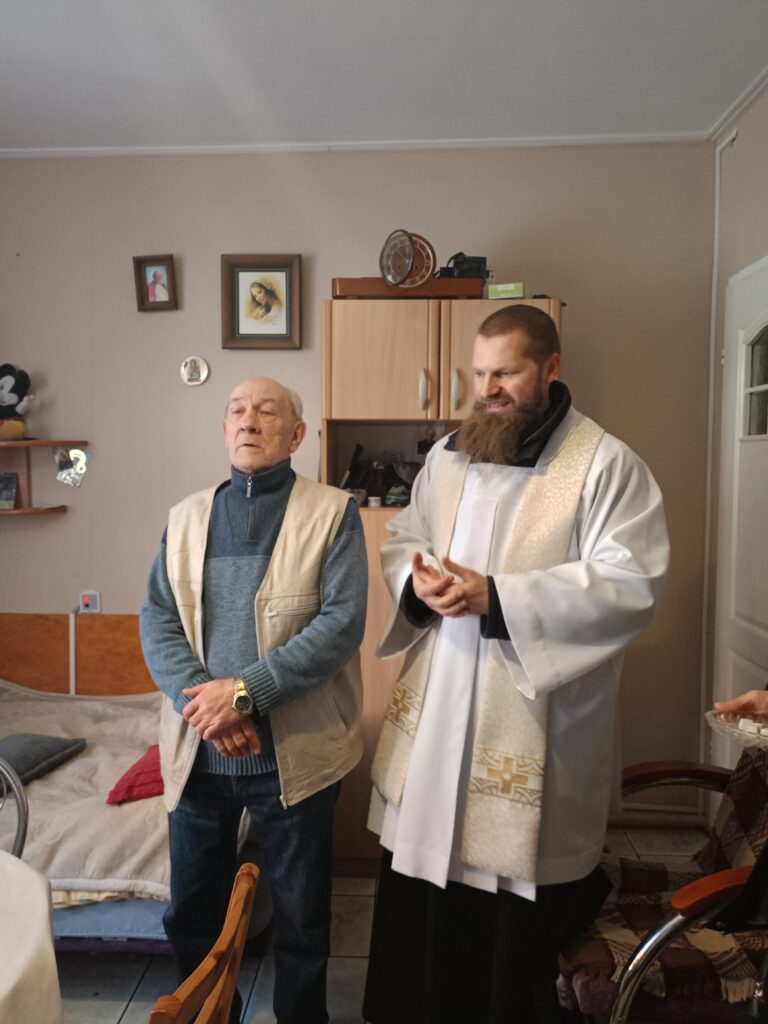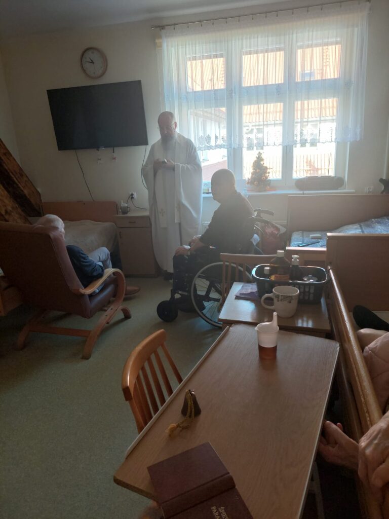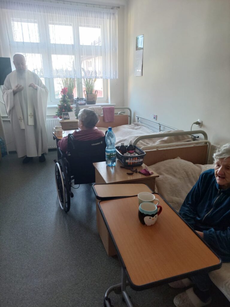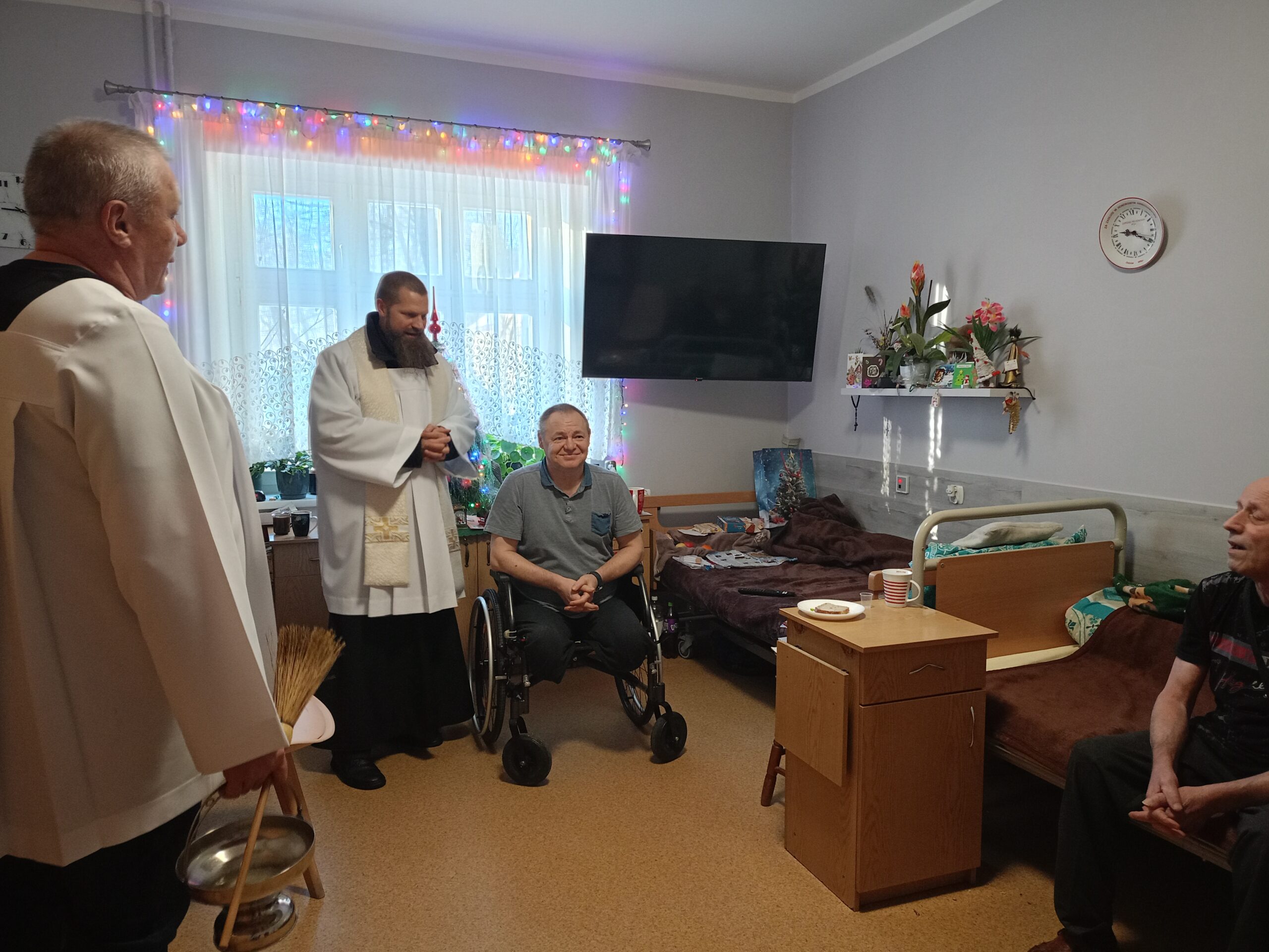 Nowy 2026 rok zaczęliśy od kolędy duszpasterskiej w naszym Domu. Księża odwiedzili każdego Mieszkańca oraz Pracownika, by przekazać błogosławieństwo. Wizyty kolędowe zostały poprzedzone Mszą Św. odprawioną w Kaplicy Domu.